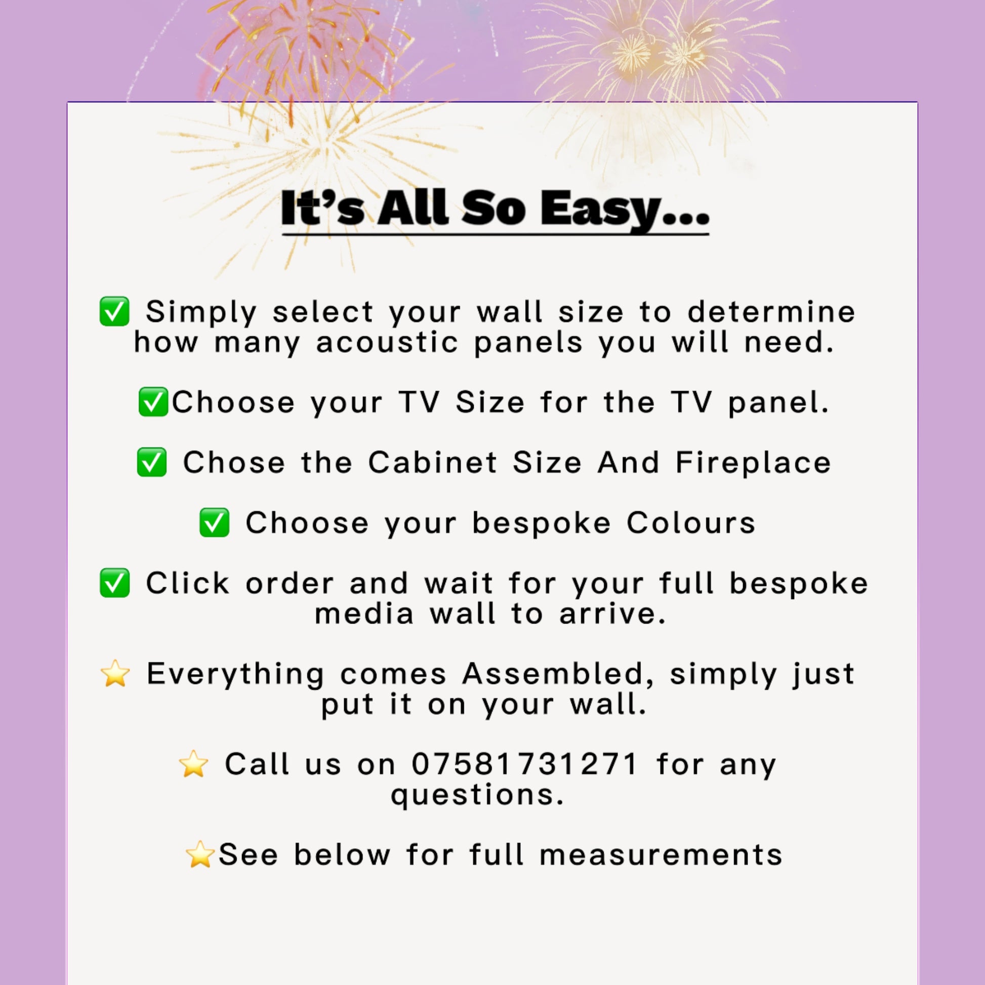 Call or send us a whatsapp message on 07581731271 and we can discuss more bespoke options for your media wall eg. more cabinet sizes and cabinet colours.
