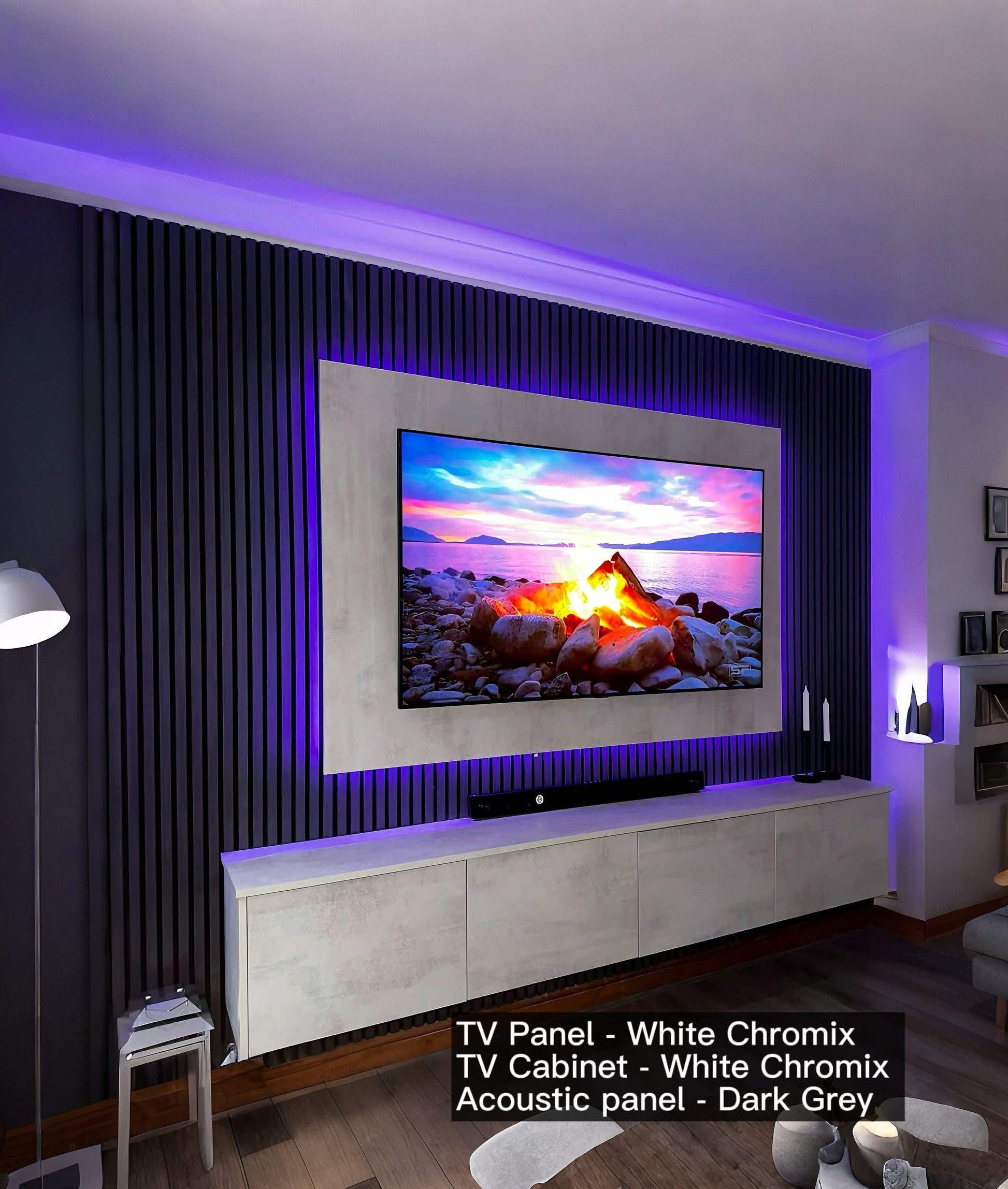 All of our TV panels are crafted from 18mm thick, sustainably sourced melamine-faced chipboard for durability and a premium finish.
