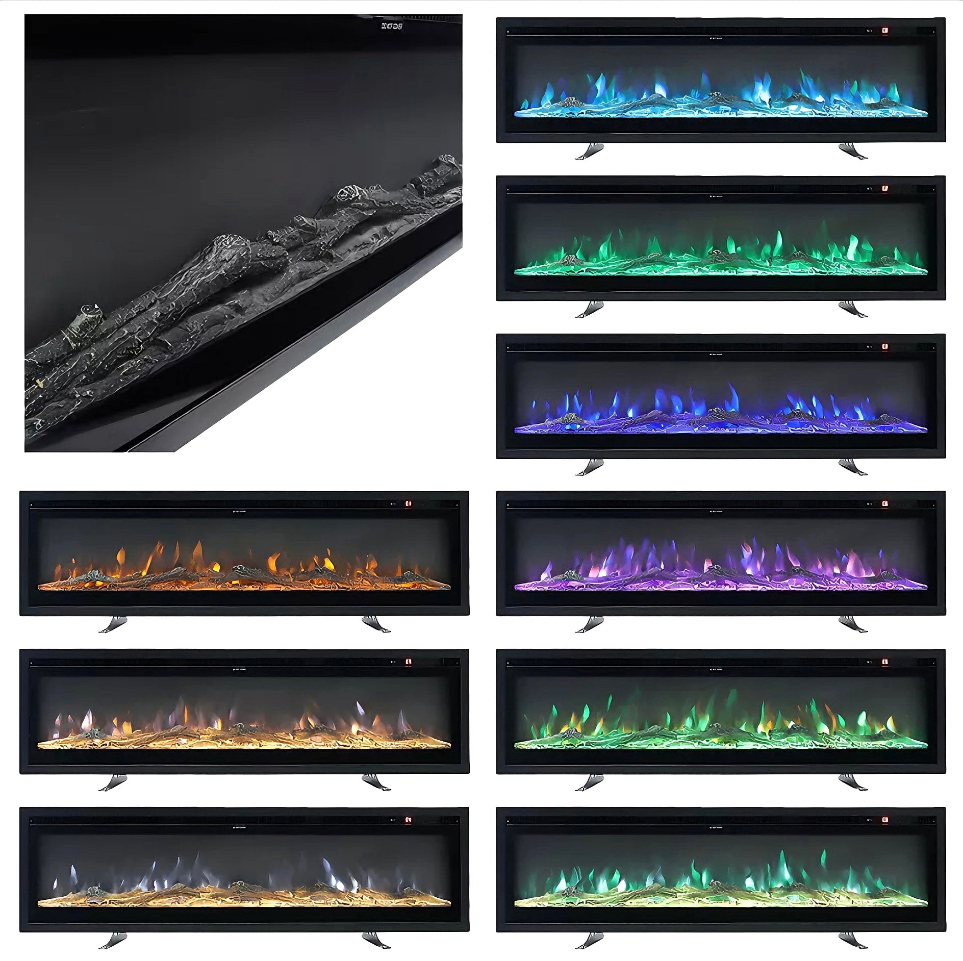 Transform your living space into a cosy and modern retreat with this sleek electric fireplace. Featuring a tempered glass design and vibrant LED flames with 9 colour options and 5 brightness levels, this fireplace creates the perfect ambiance for any mood or occasion. Whether wall-mounted, recessed, or freestanding, its versatile design complements any room style. The powerful 1500W front-facing heater warms up to 400 square feet, while the realistic artificial logs and crystal stones add a touch of elegance. Enjoy safety and convenience with an automatic shutoff and an 8-hour timer feature, all easily controlled by the included remote. Available in multiple sizes to fit any space, this electric fireplace is the ultimate combination of style, comfort, and functionality.